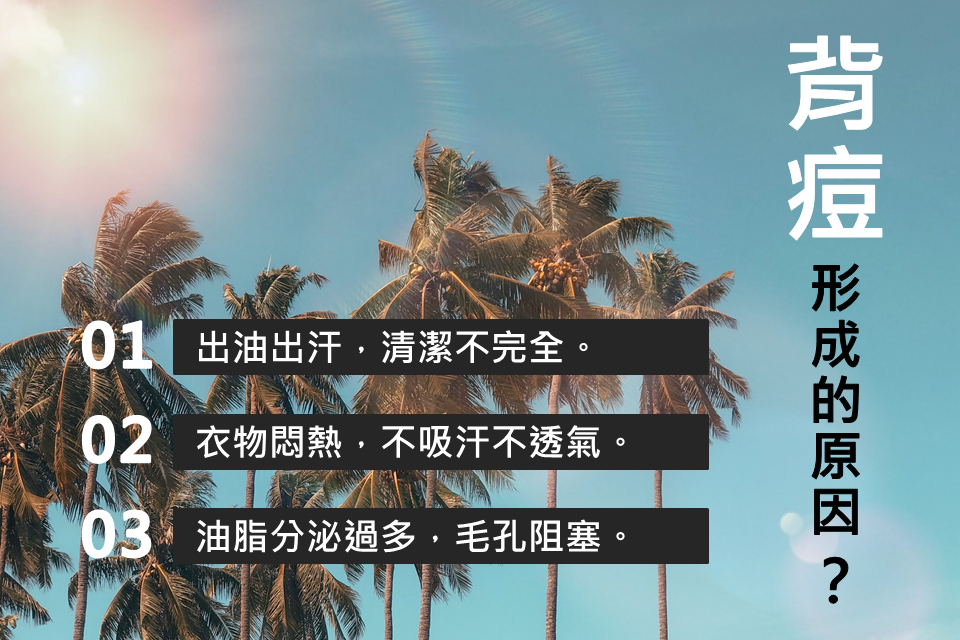 造成背痘的原因有很多,夏天的大太陽,讓人一出門就汗流浹背,若沒有確實洗淨或是洗澡後沒有擦乾背部,衣物貼附於背部容易滋生細菌;