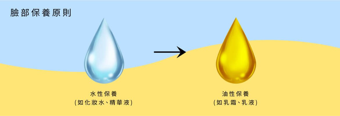 臉部保養原則:從水性保養(如化妝水、精華液)再到油性保養(如乳霜、乳液),才能讓保養品有效的吸收