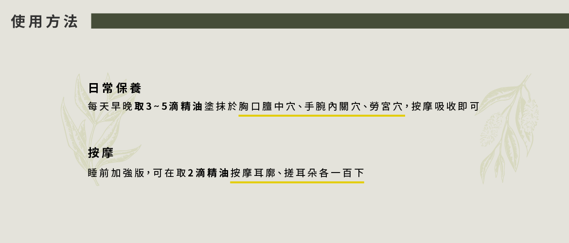 1. 每天早晚取 3-5 滴塗抹於胸口膻中穴、手腕內關穴、勞宮穴,按摩吸收即可
